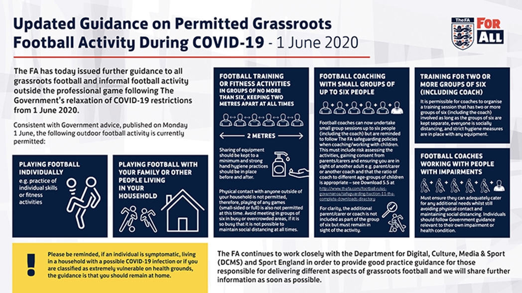 Consistent with Government advice published on Monday 1 June, the following outdoor football activity is currently permitted: