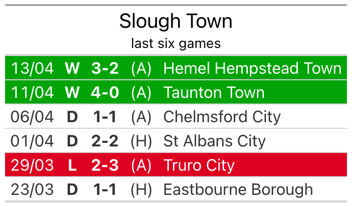 Slough’s last match was on April 13, a 3-2 win against Hemel Hempstead Town.