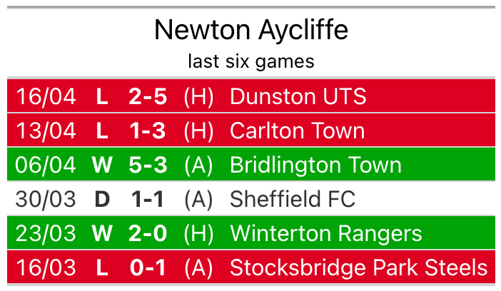 Newton Aycliffe’s last match was on April 16, a 5-2 loss against Dunston UTS.