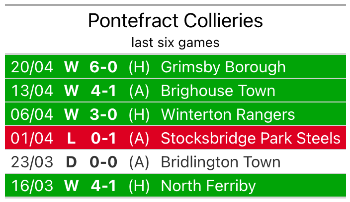 Pontefract Collieries beat Grimsby Borough 6-0 last time out, on April 20.