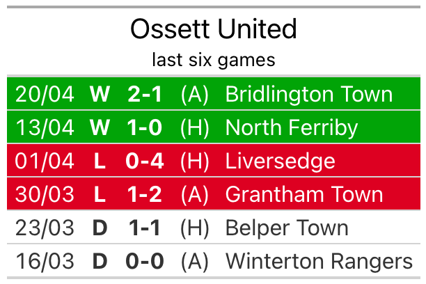 After securing all three points with a 2-1 victory over Bridlington Town on April 20, Ossett sit 17th in the Northern Premier League Division One East.