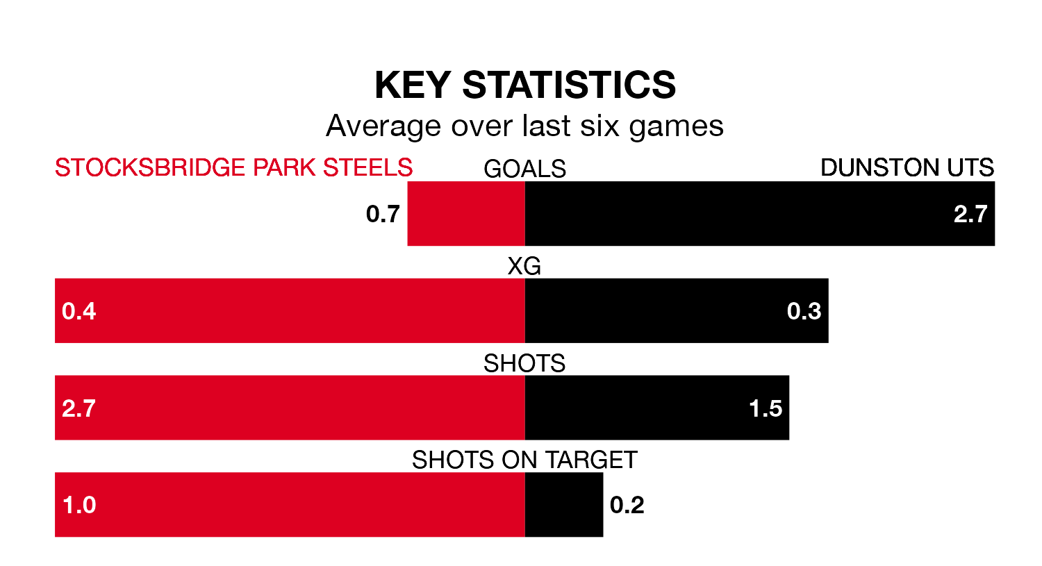 Stocksbridge, meanwhile, are below average scorers, with 1.1 goals per game, compared to a league average of 1.5. They have conceded 1.2 goals per game.