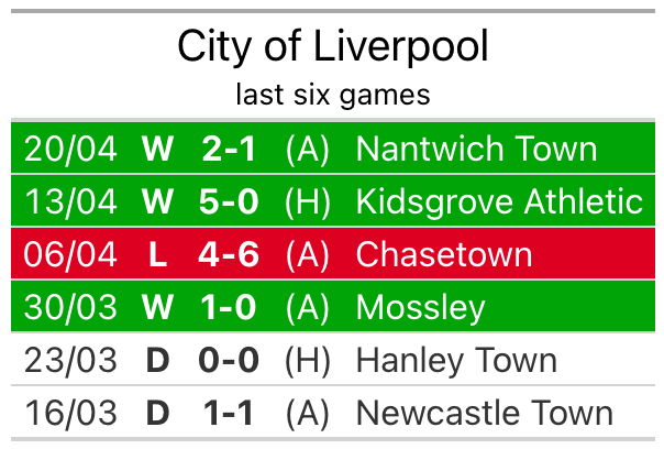 City of Liverpool’s last match was on April 20, a 2-1 win against Nantwich Town.