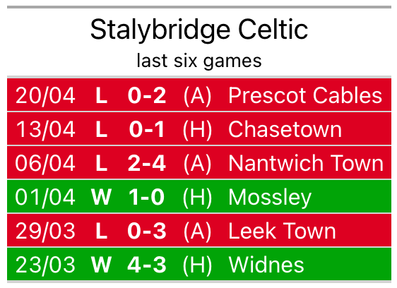 Stalybridge Celtic’s struggles have left them with six points from their last six Northern Premier League Division One – West matches, while their opponents have earned three from a possible 18.