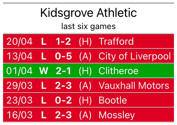 Kidsgrove lost 2-1 against Trafford last time out, also on April 20.