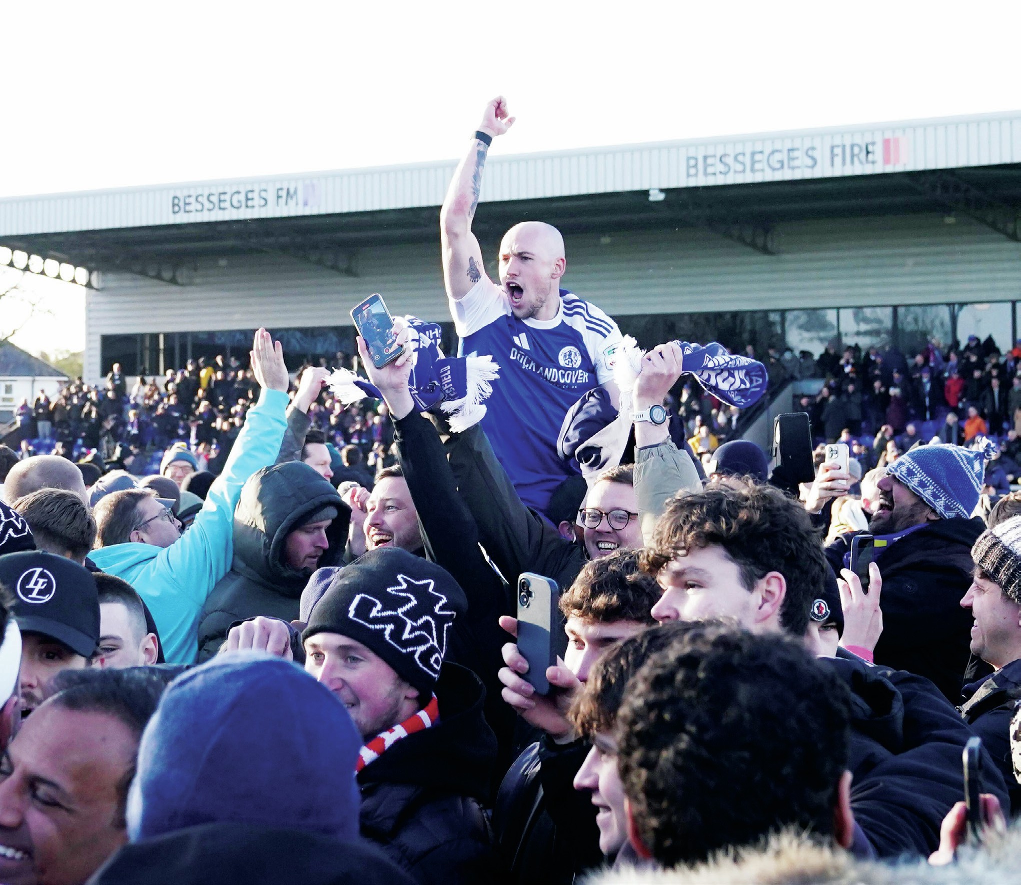 HEAD AND SHOULDERS! Josh Kay is held aloft by joyous Macclesfield fans after their historic victory over FA Cup holders Crystal Palace