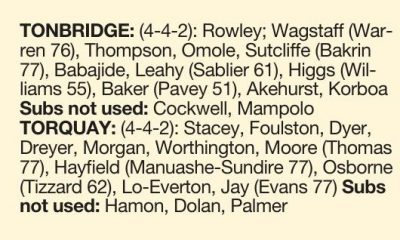 By Charlie Cole TORQUAY UNITED climbed into third place in the table, meaning they will avoid the Eliminators thanks to goals from Deon Moore and Dylan Morgan. The first real opportunity of the game came to Torquay’s Sonny Blu Lo-Everton, who was stopped with a superb tackle by Jordon Thompson....