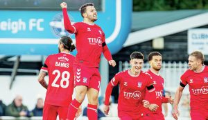 DIV 1 SOUTH By Terry Stevens PORTISHEAD TN 5 Murray 41, Feltham 62, 74, Osmond 79, Vowles 85 BISHOP’S CLEEVE 0 IN the eagerly awaited clash between the division’s two frontrunners, previously-unbeaten Bishop’s Cleeve succumbed...