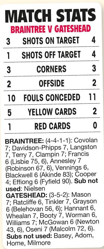 IN A display of classic new manager bounce, Braintree Town provided grit, perseverance and the odd bit of flair to share the spoils with promotion-chasing Gateshead in an enthralling 2-2 draw, despite seeing Chay Cooper...