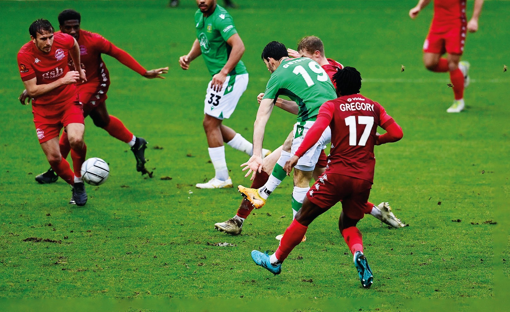 By Sheridan Robins QUIG AS A FLASH: Yeovil’s Joe Quigley slots in his first of the afternoon to make it 1-1...