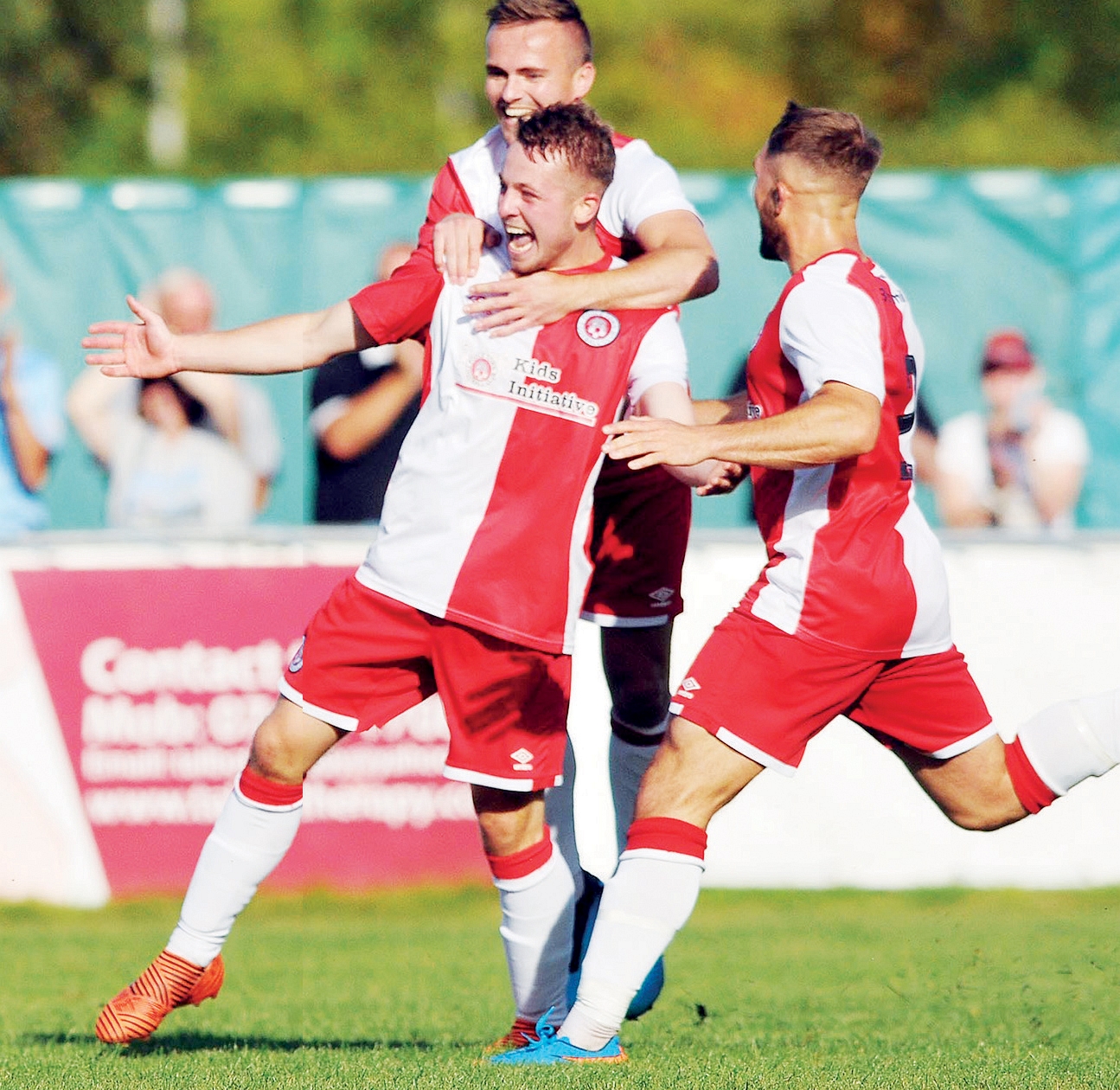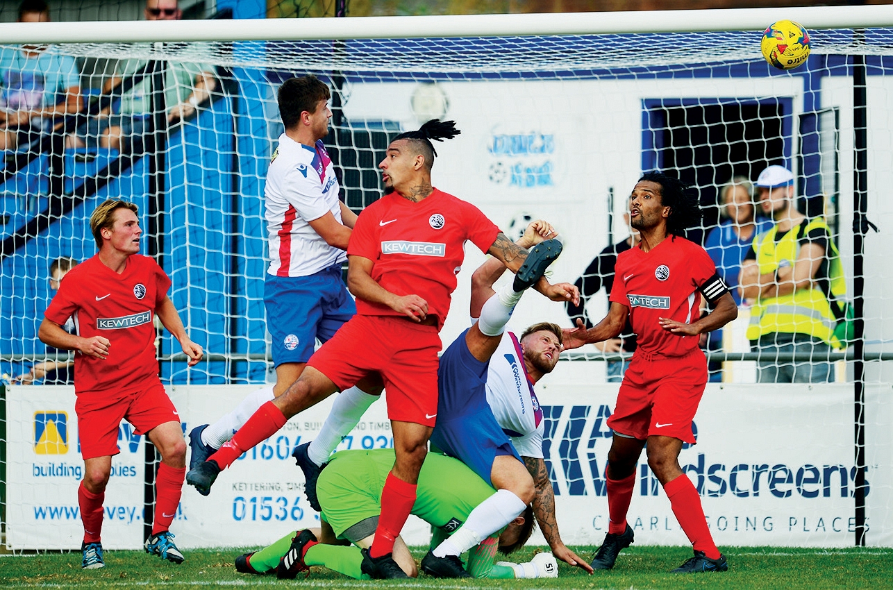 By Paul Judd GOAL TIME: Royston’s Matthew Bateman celebrates after scoring and, right, Rushden’s Alex Collard heads in the equaliser PICTURE:...