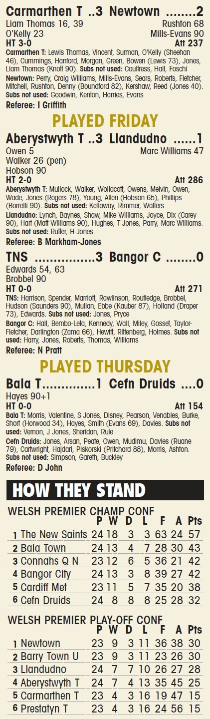 By Jay Bayford CARMARTHEN TOWN secured a dramatic 3-2 victory over Newtown in the Welsh Premier League Play-Off Conference at Richmond...