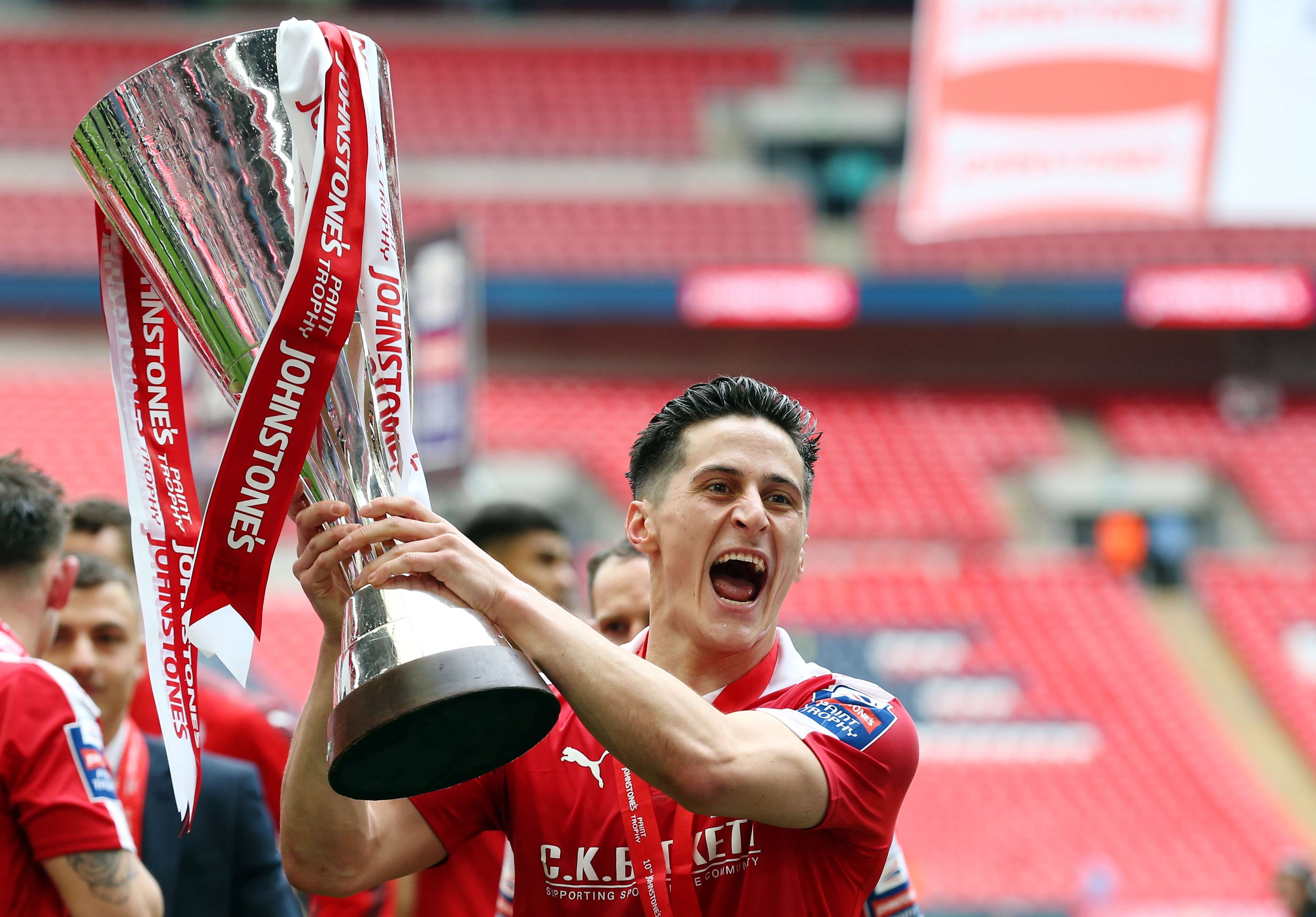 Barnsley’s George Williams, signed from Worcester City, celebrates winning the Johnstone’s Paint Trophy