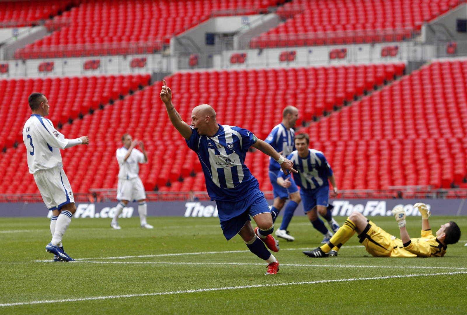 But since that first triumph he’d been diagnosed with Motor Neurone Disease. Given three years to live, he’d had to stop playing. Flying in from a holiday in America, he rushed to Wembley in time to see the second-half goals fly in. When it came to lifting the trophy with Leon Ryan, captain for the day in absence of regular skipper Davey Coulson, there was only one man who would lead them up the famous steps.