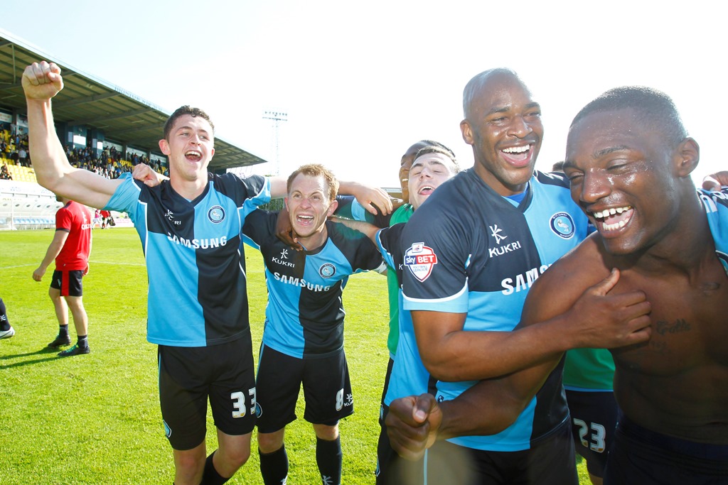 Champagne moment: Stuart Lewis celebrates promotion to League One with his Wycombe Wanderers team-mates back in 2014 (photo: Action Images / John Marsh)