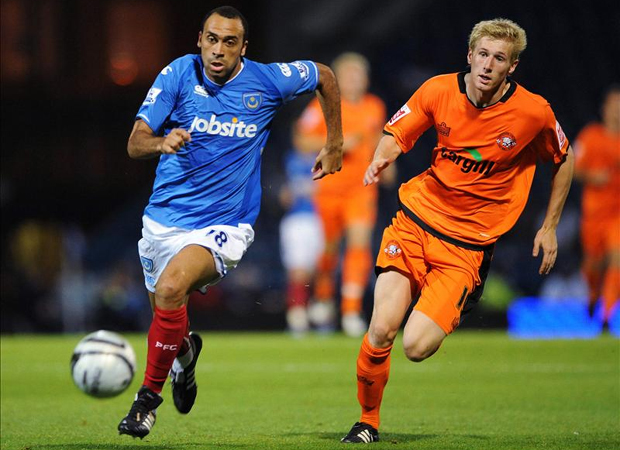 Above: Jones tracks Portsmouth’s Anthony Vanden Borre during Hereford’s Carling Cup game with Pompey in 2009/10.
