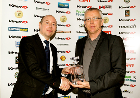 Above: FC United’s Andy Walsh, right, presented with their award last year by the Football Foundation’s Rory Carroll.