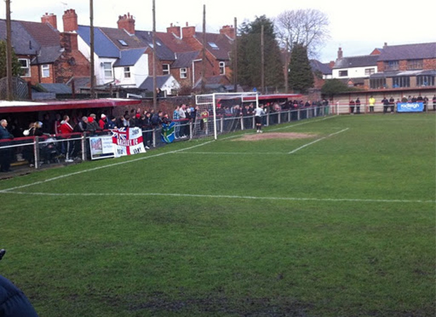 It was recently discovered that Gresley’s pitch was too short for the Northern Premier League, so The Moat is now a three sided ground: the groundsman has had to take the goal line right up to the boundary wall. A family is sitting on it to watch the game from their garden. The match is in aid of the air ambulance, so I think this is a bit penny-pinching of the wallflowers. Maybe a stray shot will pick off one or two of them like a coconut shy as punishment.