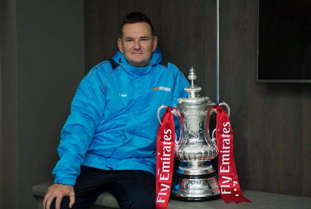 Sutton United manager Paul Doswell with the FA Cup in the plush new home dressing room (Picture: Ian Tuttle for FA)
