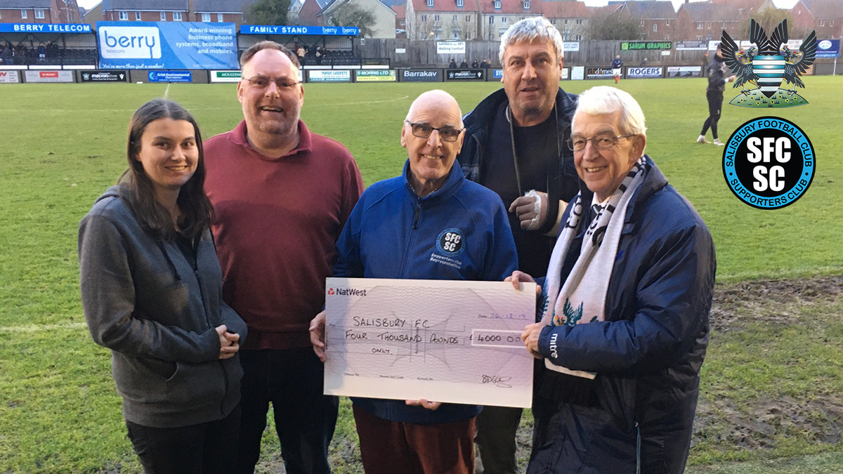 The Salisbury FC Supporters Club are pictured handing over a cheque to Salisbury chairman Ian Hammond during yesterday’s half-time break at the Southern League Premier Division South clash at the Raymond McEnhill Stadium.