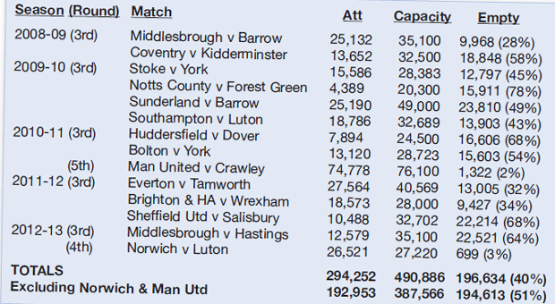 Ignoring the Carrow Road and Old Trafford games, the other 12 have been played out in front of 194,613 bare seats – that’s 51 per cent of the grounds’ combined capacity.