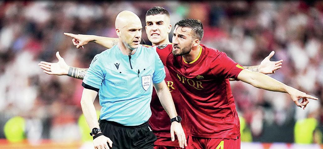 SURROUNDED: Referee Anthony Taylor is confronted by Roma players during the Europa League final on Wednesday night