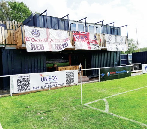 PRIDE OF PLACE: The Alan Smith Stand at Newcastle Blue Star’s Scotswood Stadium and adorning flags, inset