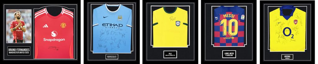 L-R: Signed Bruno Fernandes Man Utd Shirt £539.99, Manchester City Fully Signed Shirt £799.99, Pele Signed Jersey £999.99, Lionel Messi Signed Shirt £1.999, Signed Arsenal Invincibles Shirt £4,000.