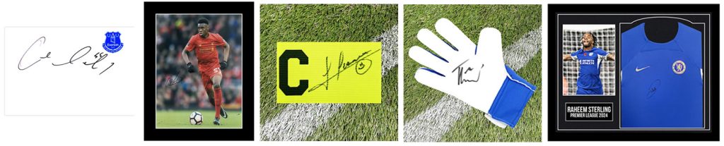 L-R: Conor McAleny (Everton( Autograph £2.79, Signed Ovie Ejaria (Liverpool) Photo £9.99, Jefferson Lerma (Crystal Palace) Armband £23.99, Tom Heaton (Man Utd) £69.99, Signed Raheem Sterling Chelsea £99.99.