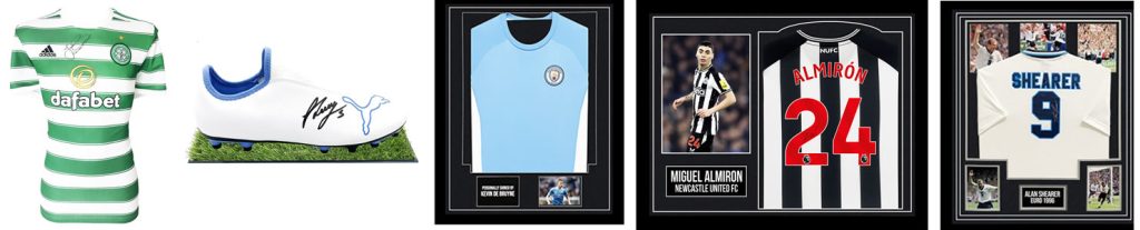 L-R: Signed James McCarthy Celtic Shirt £119.99, Michael Keane Framed Everton Boot £249.99, Kevin De Bruyne (Man City) Framed Shirt £329.99, Miguel Almiron Signed Newcastle Shirt £399.99, Alan Shearer Framed Euro 1996 Shirt £499.99