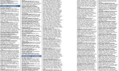 (ko 3pm unless stated) NATIONAL LGE SOUTH: Worthing v Bath City ISTHMIAN LGE Premier: Cray Wanderers v Folkestone Invicta NORTH WEST COUNTIES LGE Premier: AFC Liverpool v Squires Gate WESSEX LGE Premier: Moneyfields v Portland Utd THE FA SUNDAY CUP Semi-final (ko 2pm): Trooper v AFC Hackleton (at Northampton Tn FC), Home Bargains v Highgate Albion (at Kidderminster Harriers FC)