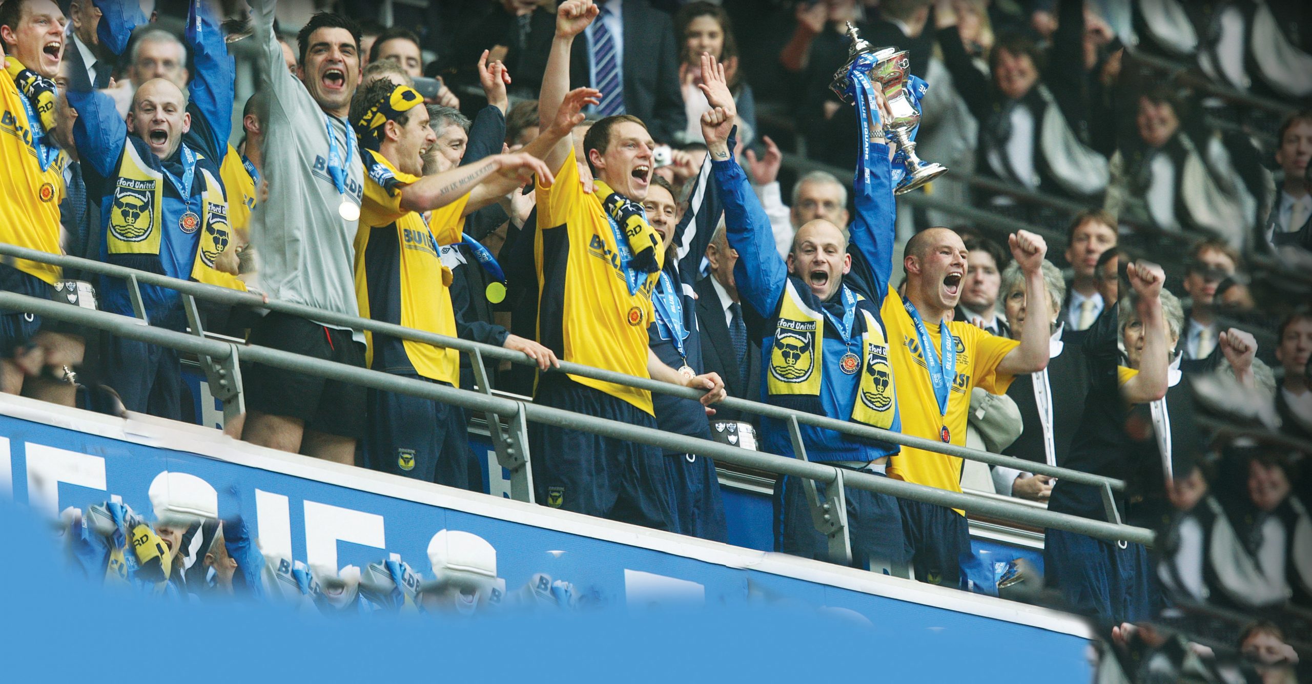 U’S BEAUTY! Oxford United lift the Blue Square Play- Off trophy at Wembley and, right, celebrate