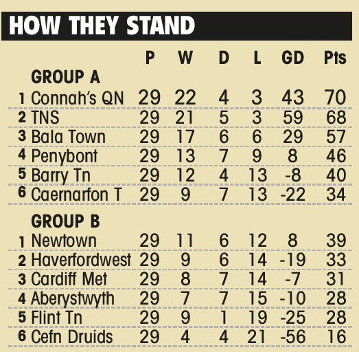 A 95th minute equaliser for Caernarfon Town to make it 2-2 at home against Penybont meant Bala cannot now be caught in third place. It was a case of many happy returns to The Rock for James Davies as he came off the bench for Newtown to hammer home a 14 minute hat-trick against his former club in Play-Off Conference leaders Newtown’s 7-0 win over Cefn Druids.