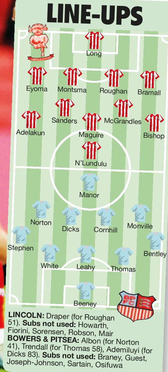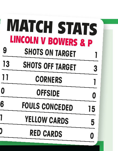 Bowers had the better of the first half and went close to breaking the deadlock when Max Cornhill rattled the Lincoln crossbar with a rasping half-volley, while Jamie Dicks’ free-kick forced keeper Sam Long into a fine save.