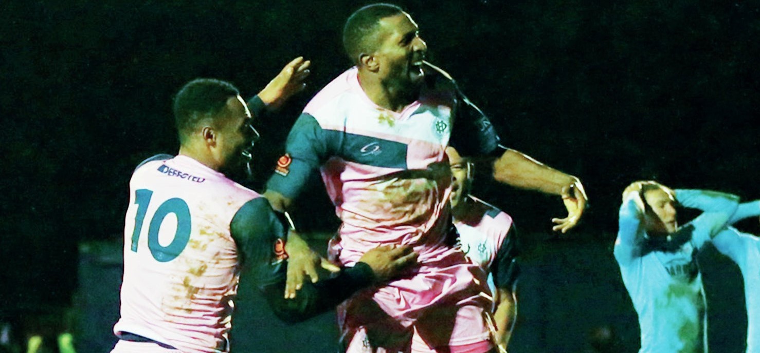 HEARTACHE! Tyrone Sterling is congratulated after firing Dulwich Hamlet’s winner, much to the angst of the Brentwood players