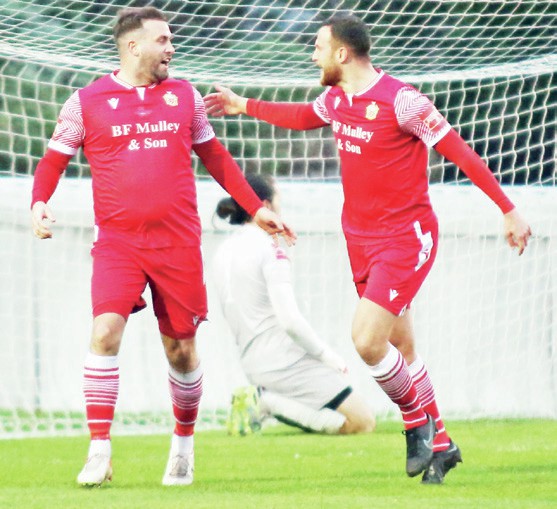 SAM THE MAN: Hornchurch goal scorer Sam Higgins, left, celebrates his goal against Cray