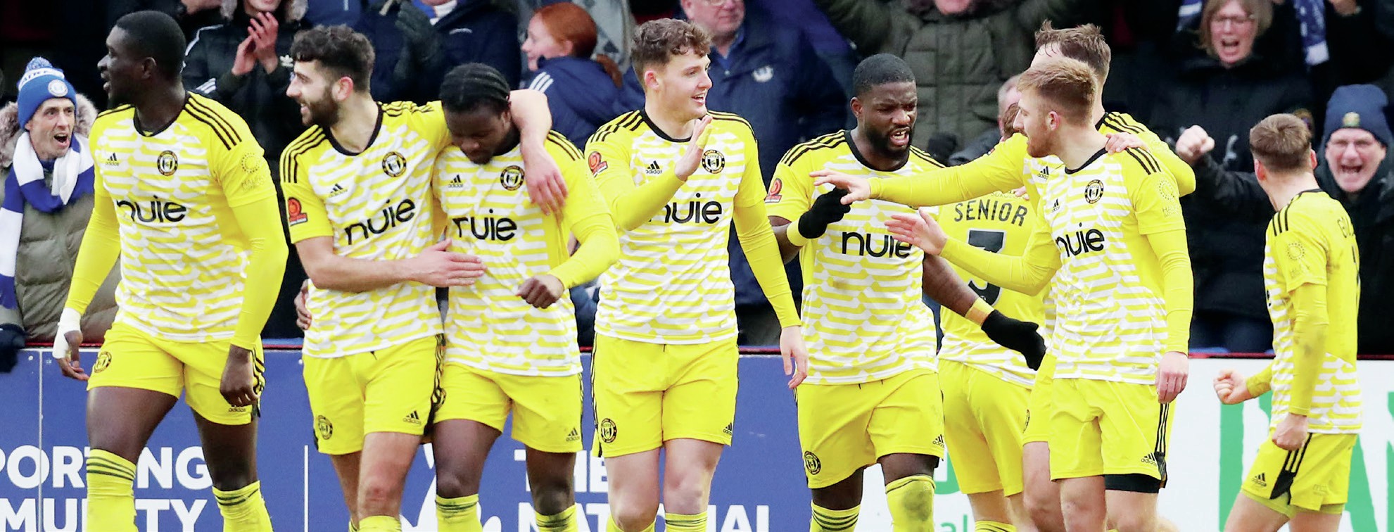 TEAM SPIRIT: FC Halifax celebrate Harvey Gilmour’s clincher at Aldershot in the last eight