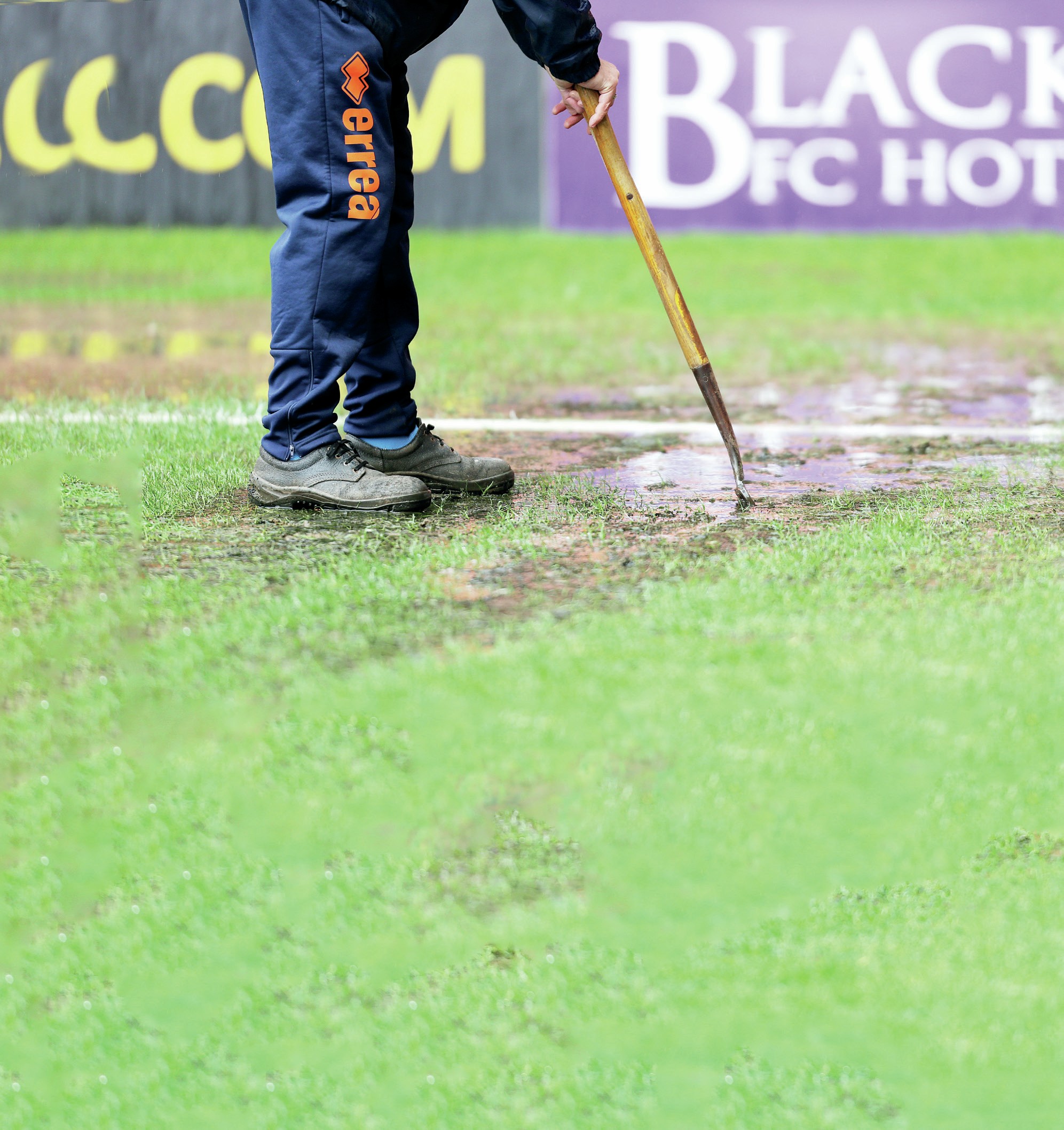 GAME OFF! Scenes such as this have been common place in recent weeks. Inset: Ashton United’s flooded pitch at the Hurst Cross Stadium
