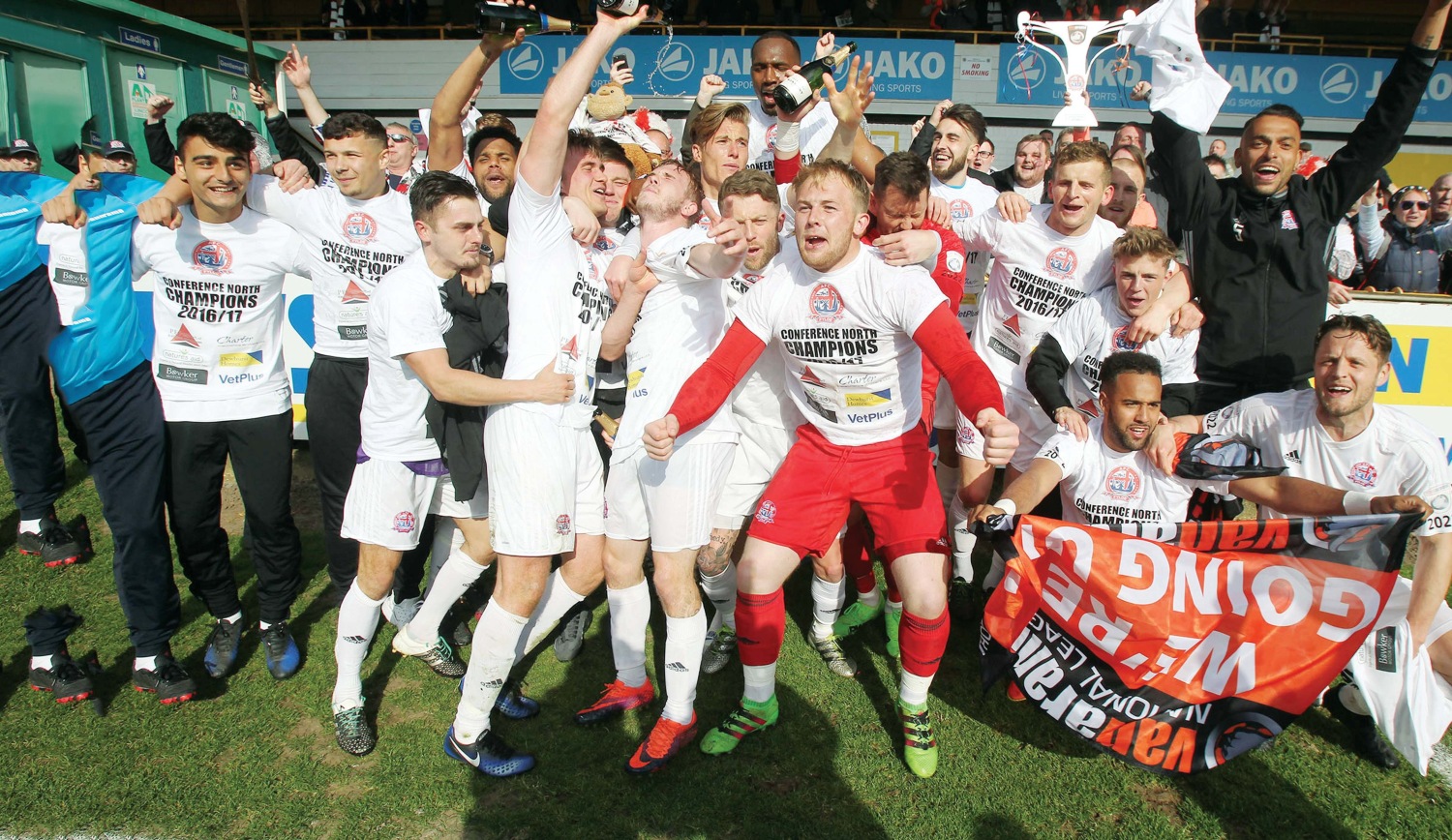 CHAMPIONS! AFC Fylde players celebrate winning the National League North title under manager Dave Challinor, inset