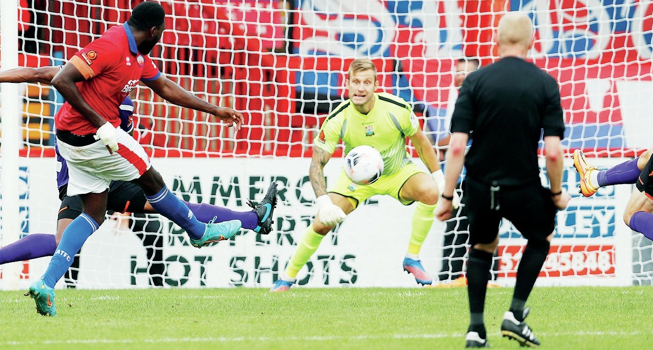 DOUBLING UP: Inih Effiong slots home his and Aldershot Town’s second goal