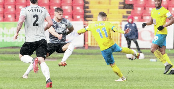 AIM...FIRE! Adam Campbell goes close for the Heed, Inset, Cardiff City loanee Kieron Evans volleys home Torquay’s equaliser at the International Stadium.