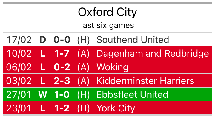 Oxford have won one and drawn one of the last six, while the Spitfires have taken two draws and four losses.