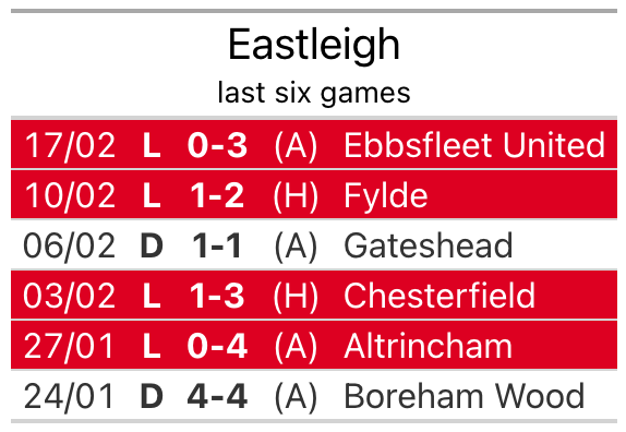 Eastleigh lost 3-0 against Ebbsfleet United last time out, also on Saturday.