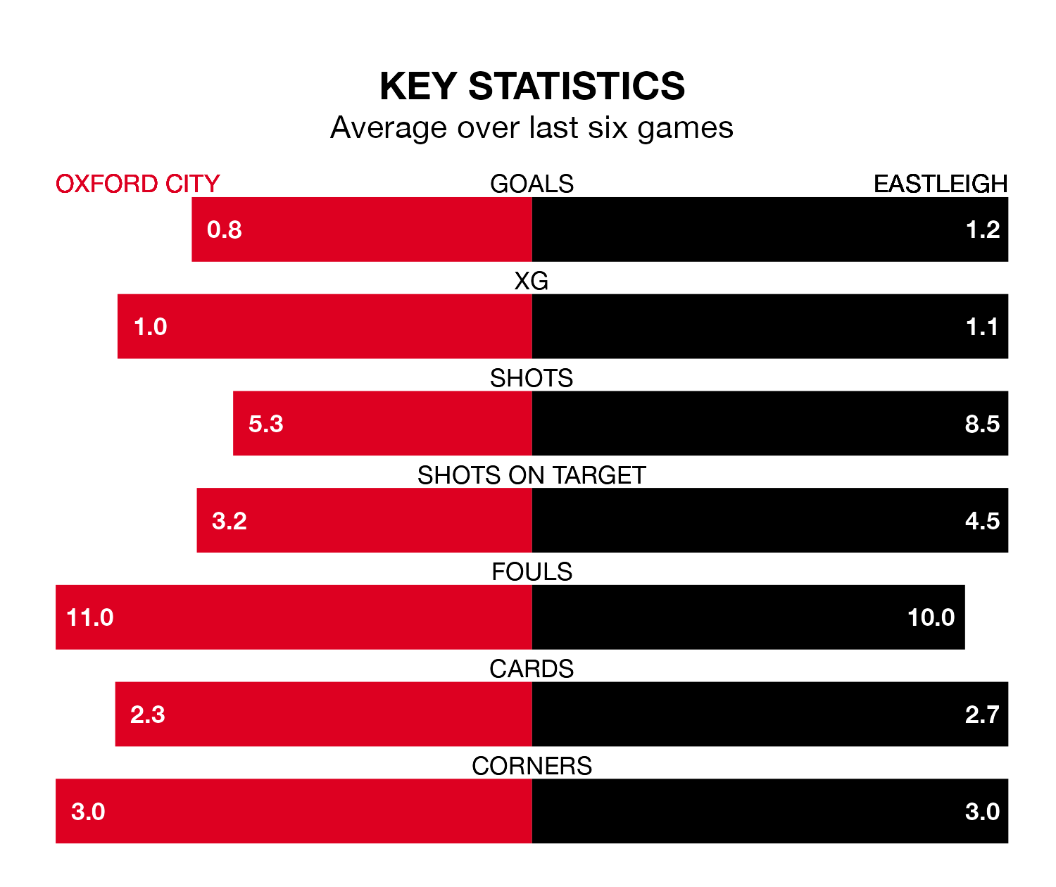 Oxford City and Eastleigh both come into Tuesday’s late kick-off at the RAW Charging Stadium in poor form, having picked up four and two points respectively in their last six games.
