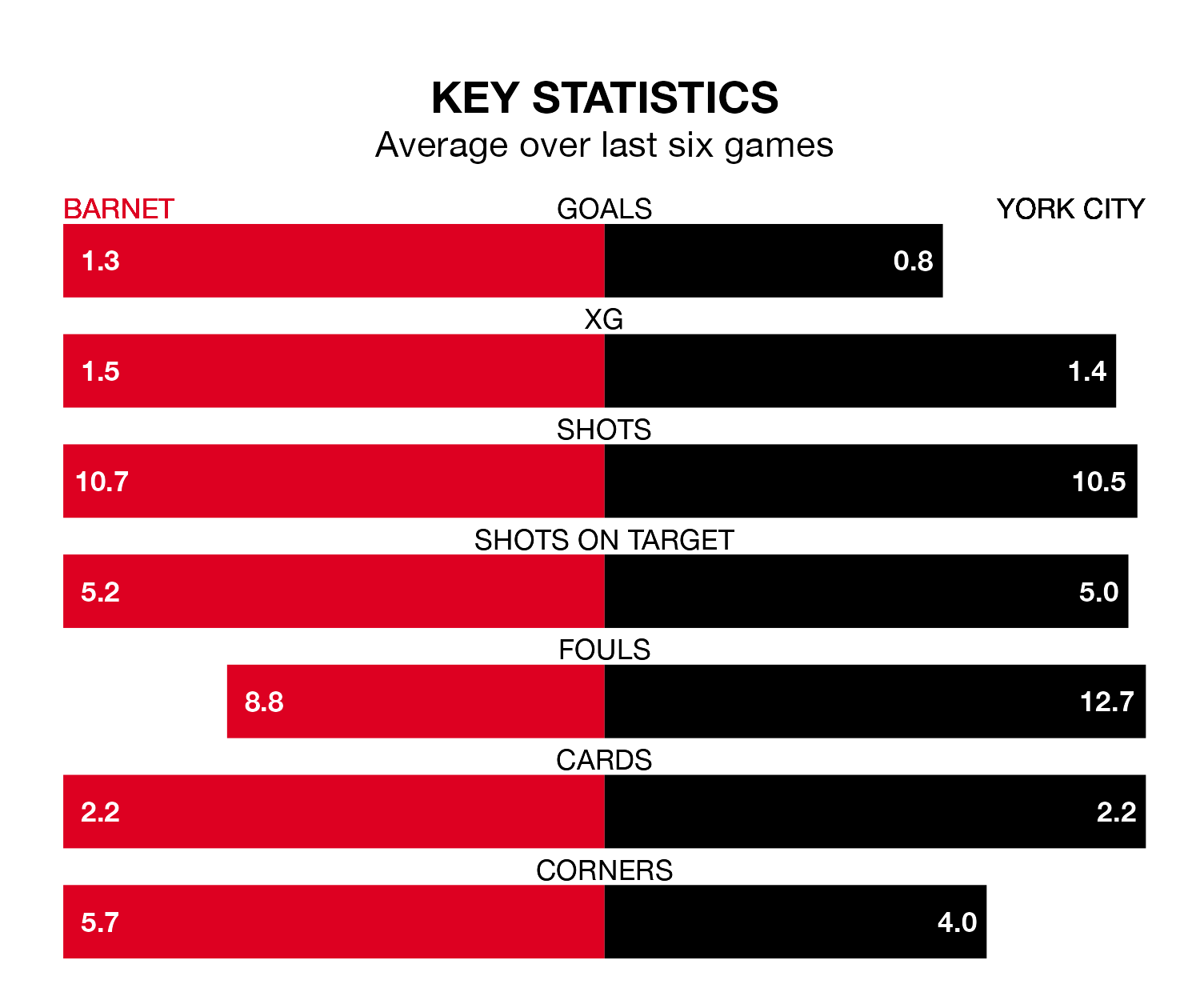 York, meanwhile, are below average scorers, with 1.3 goals per game, compared to a league average of 1.5. They have conceded 1.5 goals per game.
