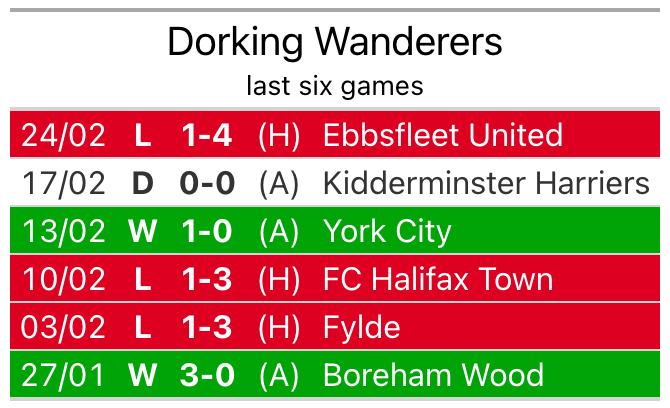 Dorking’s last match was on Saturday, a 4-1 loss against Ebbsfleet United, with Charlie Carter getting the goal for Wanderers.
