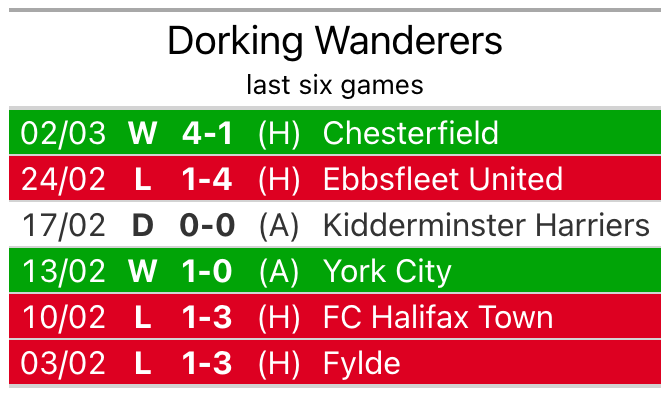 Dorking beat Chesterfield 4-1 last time out, also on Saturday, with Alfie Rutherford (two), Daniel Pybus and Tom Blair on the scoresheet.