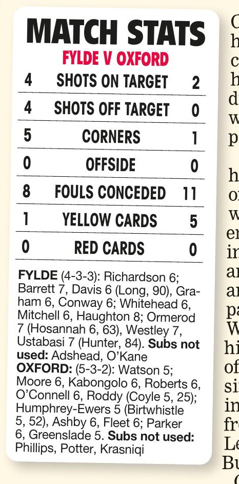 Oxford were on the end of three yellow cards in the first half but were ultimately defensively sound at the back limiting Fylde’s chances.