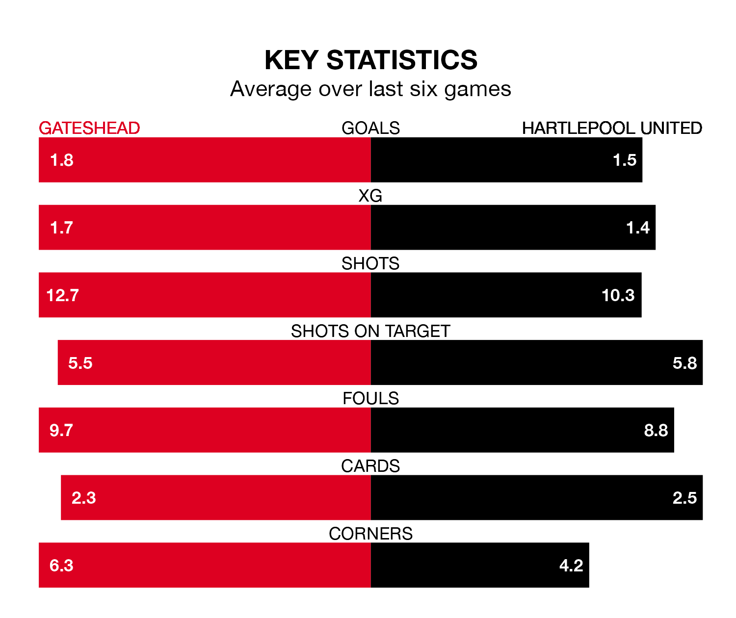 With two wins and two draws over that period, Pools’ form is slightly better – they have taken eight points from 18, compared to Gateshead’s seven.