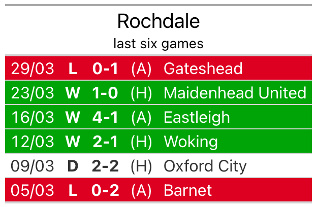 In their last league match, on Friday, Rochdale lost to Gateshead 1-0 away.